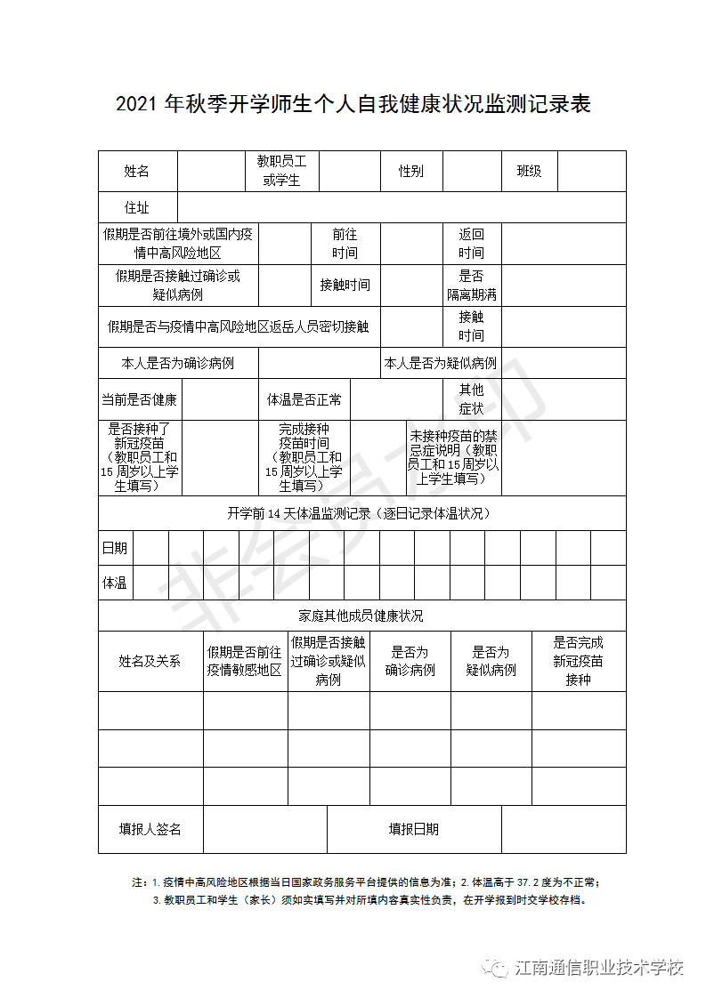 開學(xué)時請攜帶紙質(zhì)2021年秋季開學(xué)師生個人自我健康狀況監(jiān)測記錄表格上交學(xué)校。
