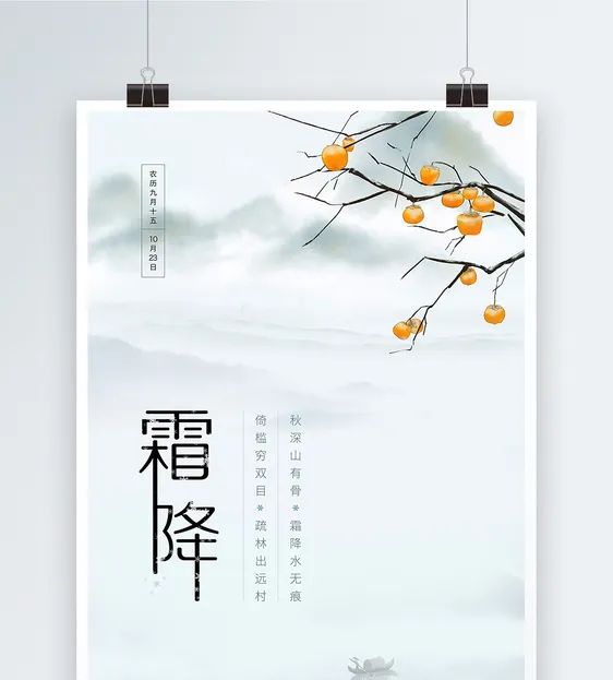 霜降二十四節(jié)氣之一,天氣漸冷,開始有霜。霜降一般是在每年公歷的10月23日,太陽到達(dá)黃經(jīng)210度時為二十四節(jié)氣中的霜降。霜降是秋季的最后一個節(jié)氣,是秋季到冬季的過渡節(jié)氣。秋晚地面上散熱很多,溫度驟然下降到0度以下,空氣中的水蒸氣在地面或植物上直接凝結(jié)形成細(xì)微的冰針,有的成為六角形的霜花,色白且結(jié)構(gòu)疏松。
